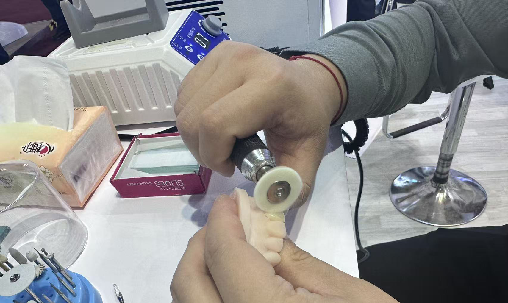2.粘接与修复系列:如光固化树脂聚合瓷(技工用)、不含丁香酚的暂时粘接水门汀等,众多技工师傅就其抛光和粘接效果与我们的工程师进行了探讨。