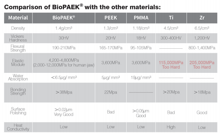 Traditional metal and zirconia materials are strong but rigid in comparison with BioPAEK®. The E-modulus of BioPAEK® lies in the range of 4000 MPa, which is very close to human bone. So, the chewing or impact forces with BioPAEk® is greatly reduced due to BioPAEK® cushion function especially for implant-supported bridges.The elastic modulus of BioPAEK® is equivalent to human jaw, the restoration with BioPAEk® plays a role as a"shock absorption'. Therefore, it is suitable for the upper implant.